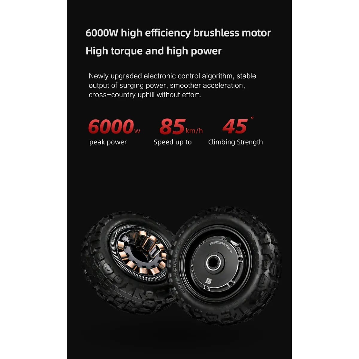 Puissance élevée avec double moteur de 6000 W offrant une vitesse maximale de 85 km/h.