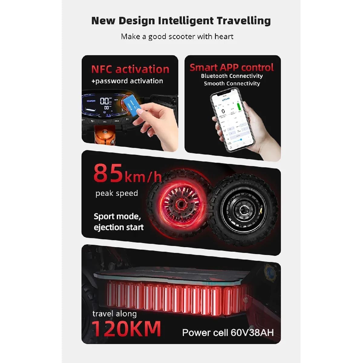 Autonomie record : Batterie 60V 38Ah (2280Wh) offrant jusqu’à 120 km d’autonomie, parfaite pour les trajets longue distance.