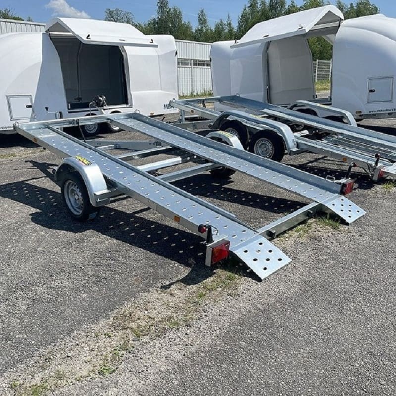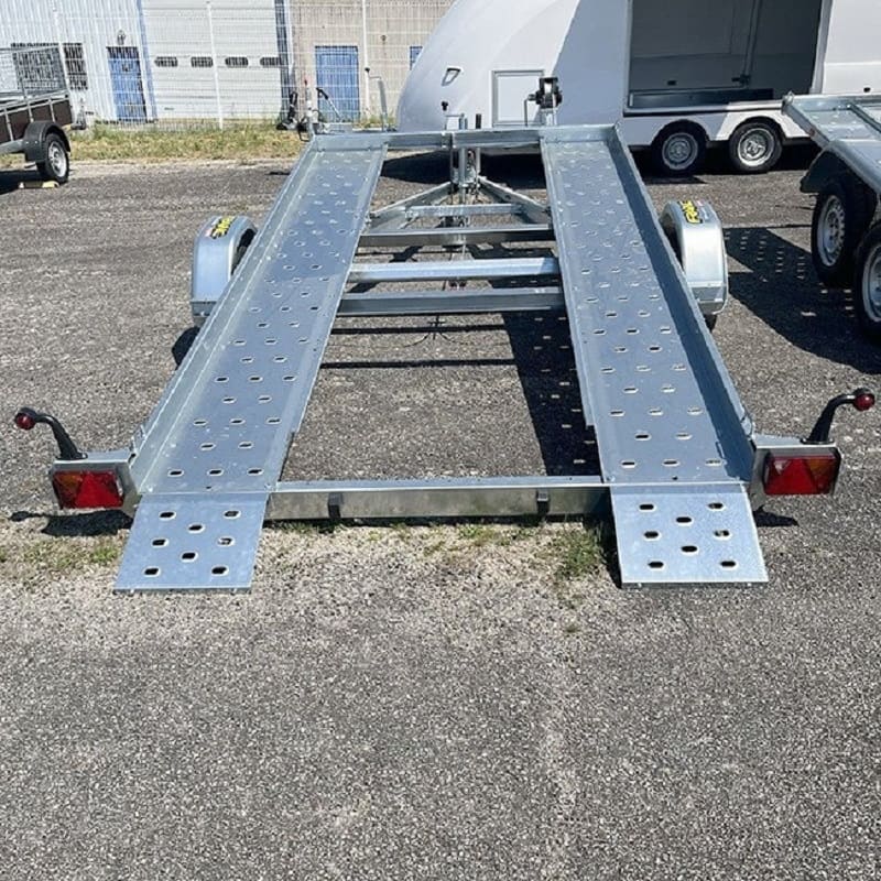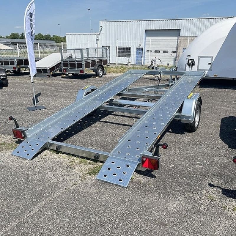 Cette remorque est idéale pour le transport de voitures, motos ou petits utilitaires. Son PTAC ajustable (de 1000 à 1600 kg) offre une grande polyvalence.