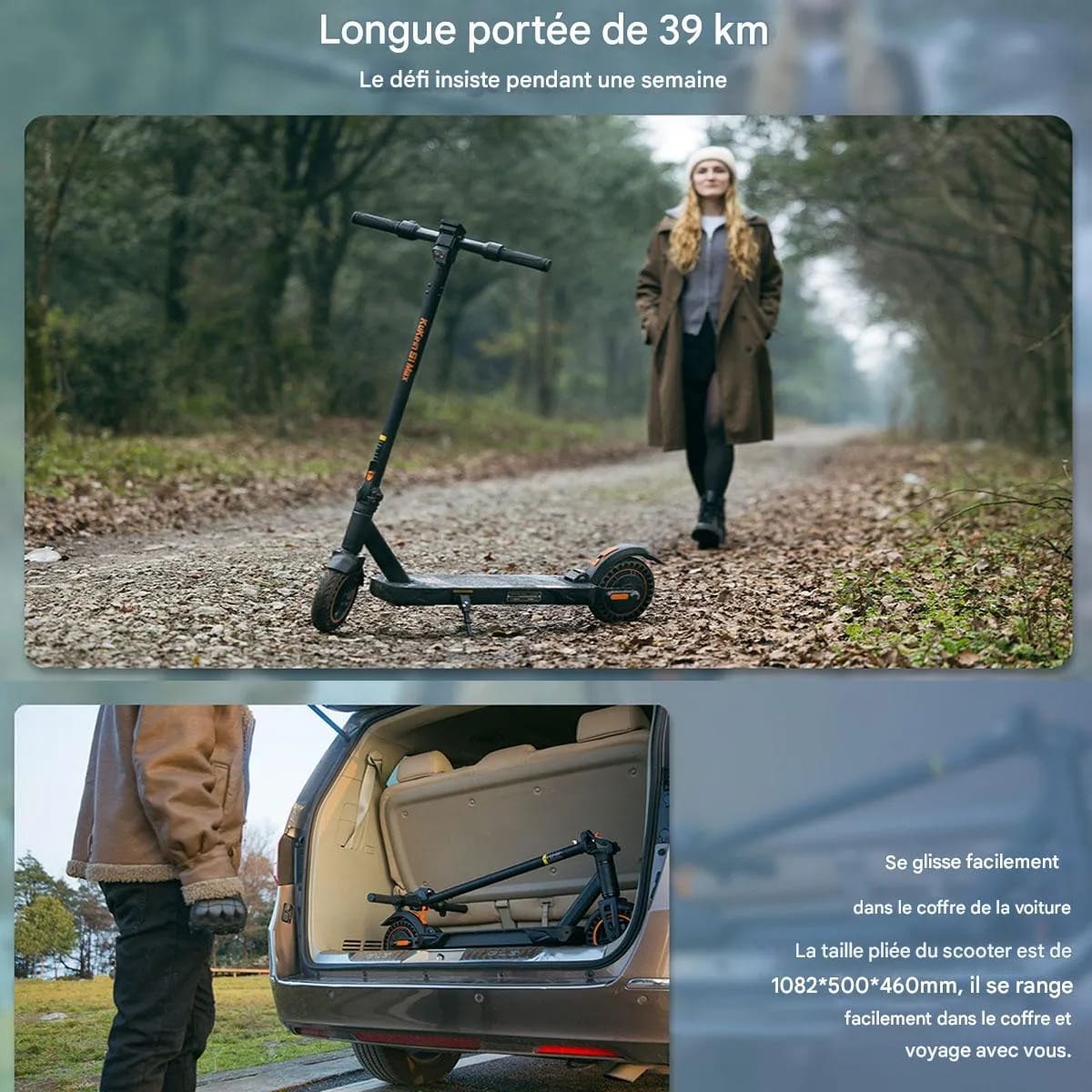 Conçue pour la mobilité moderne, la Kukirin S1 Max est une trottinette électrique légère, pliable et performante, idéale pour vos déplacements quotidiens. Elle allie puissance, autonomie et confort dans un format compact, facile à transporter et à ranger. Son moteur de 350 W (crête 500 W) atteint une vitesse de 30 km/h, avec une autonomie généreuse de 39 km.