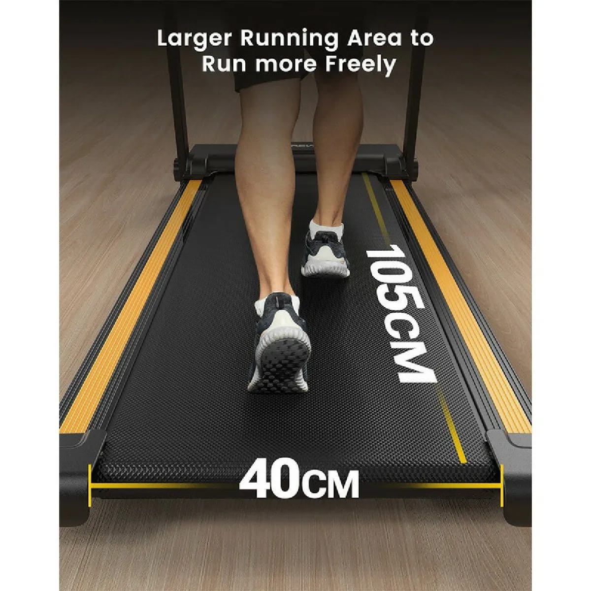 Le tapis roulant compact pliable Urevo URTM006 offre une bande de course antidérapante de 40 cm de large, soit 16 pouces. Cette largeur confortable convient à la grande majorité des utilisateurs. Elle assure une foulée naturelle et sécurisée, même pour ceux qui débutent ou qui ont besoin d’un bon maintien. Vous courez en toute confiance, sans craindre de sortir de la zone.