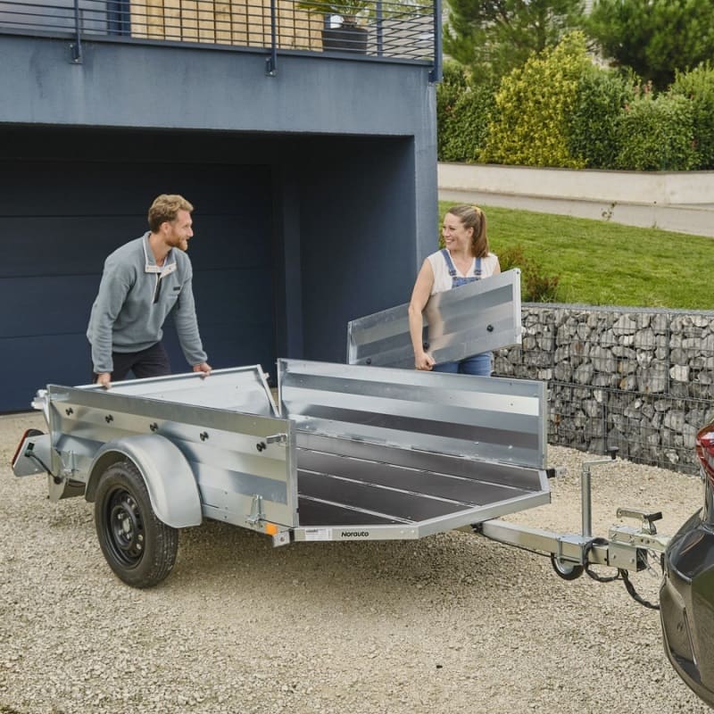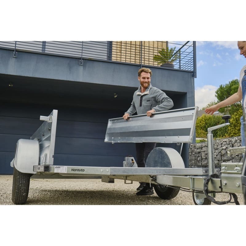Les ridelles peuvent aussi jouer le rôle de réhausses remorque 750 kg NORAUTO. Cette modularité vous permet d’adapter votre remorque à la charge du jour. Besoin de transporter du vrac un jour, des équipements le lendemain ? Le système s’adapte rapidement, sans démontage complexe.