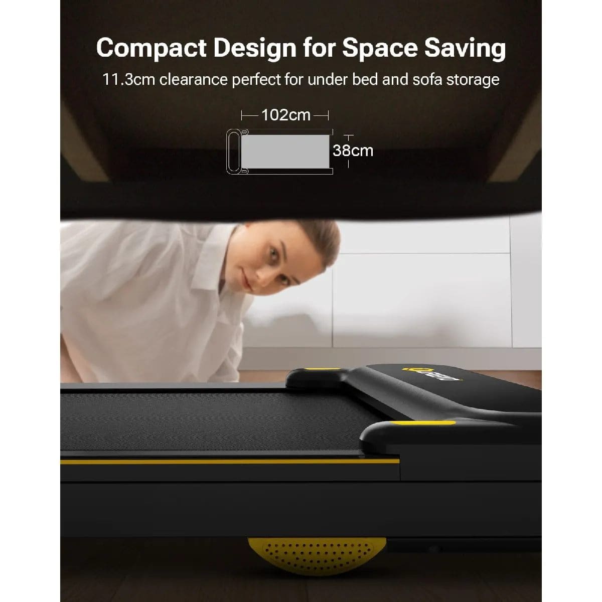 Ses dimensions réduites (121 x 48 x 11,3 cm) lui permettent de se glisser sous un lit, un canapé ou même dans un coin discret d’un bureau. Il ne nécessite aucun montage ni configuration complexe. L’utilisateur peut simplement le sortir de son emballage, le brancher à une prise électrique, et commencer sa séance de marche immédiatement.