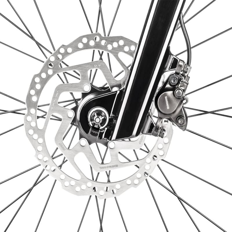 Le vélo s’équipe de freins à disque hydrauliques Shimano MT200, offrant une grande puissance de freinage. Ces freins assurent une sécurité optimale en ville, même par temps de pluie. Vous pouvez compter sur eux pour des arrêts rapides et contrôlés, même dans des conditions difficiles.