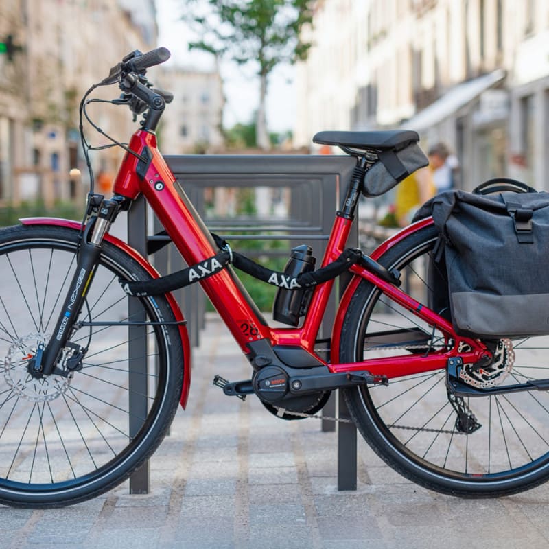 Cadre Samedi 28 / Open, tubes, épaisseur variable, axe serrage rapide 9×135 mm, antivol AXA Block XXL (clé batterie)
